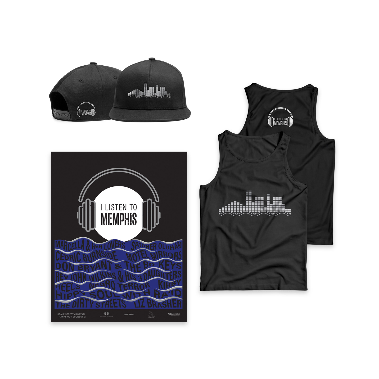 The client created a series of music videos featuring musicians with roots in Memphis. They were seeking a visual identity that could be used in fun video animations as well as on apparel, tour posters and other merchandise frequently sold at concerts. The sound board LED bars are in the shape of the skyline of downtown Memphis.